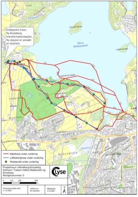 Den 18/10-21 ble vi gjort oppmerksom på at Lyse Elnett har inkludert et nytt luftlinje alternativ i sine planer (Se trase 11 i vedlagte oversiktskart). Denne luftlinjen vil gå på tvers av hull 9, 18, 15, 11 (green), 12 og 4 og på langs av hull 13. Luftkabel vil ha master på mellom 20 og 30 meter, og luftkabelen vil henge mellom 7-10 meter over bakken. Dette alternativet innebærer tre felling, stor «kollisjonsfare», og generelt føre til en rasering av vår bane og vårt flotte anlegg. Dette alternativet vil få alvorlige konsekvenser for Stavanger golfklubb, både golfteknisk og økonomisk.